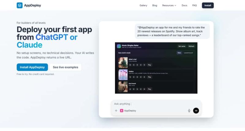 AppDeploy turns natural-language prompts in ChatGPT, Claude, and other coding agents into live, hosted web applications.