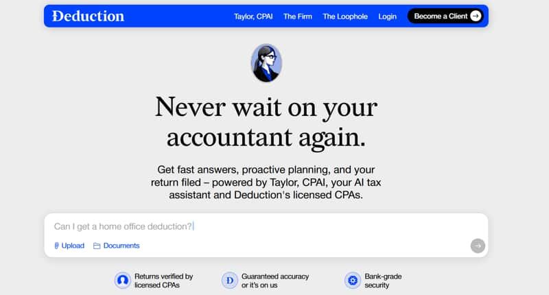 Get fast answers, proactive planning, and your return filed powered by Taylor, CPAI, your AI tax assistant and Deduction's licensed CPAs.