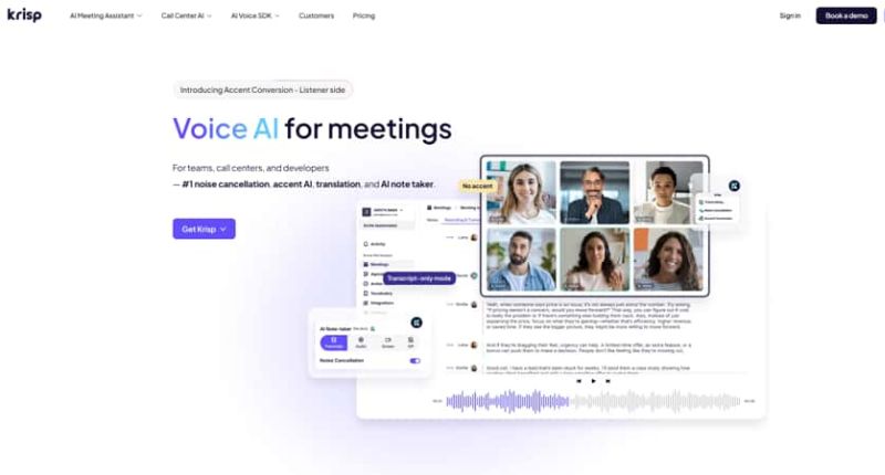 Krisp is an AI-powered platform that enhances online meetings by removing background noise, transcribing, and summarizing conversations for improved productivity.