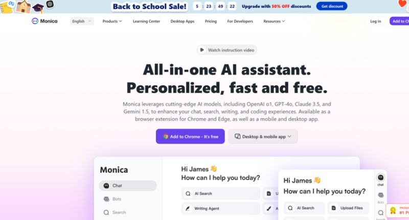 Monica is an AI-powered assistant enhancing productivity through chat, writing, coding, and search across multiple platforms.