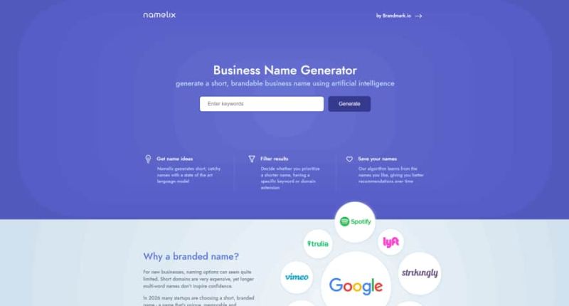 Namelix generates short, branded names that are relevant to your business idea. When you save a name, the algorithm learns your preferences and gives you better.