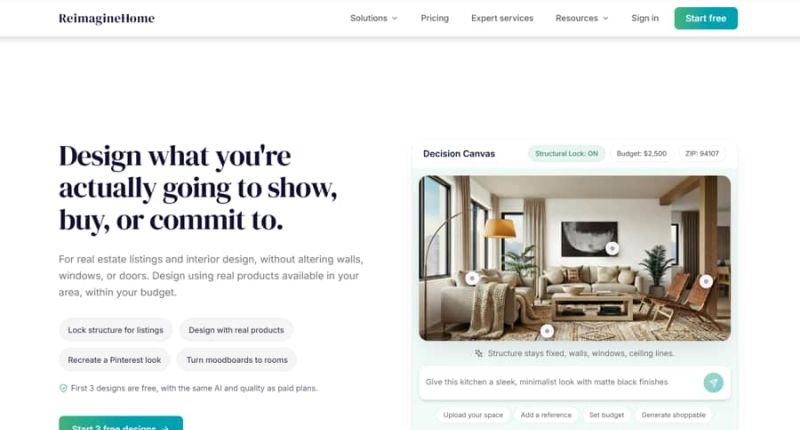 For real estate listings and interior design, without altering walls, windows, or doors. Design using real products available in your area, within your budget.