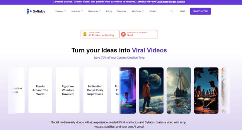 Social media-ready videos with no experience needed! Find viral topics and Syllaby creates a video with script, visuals, subtitles, and your own AI voice.